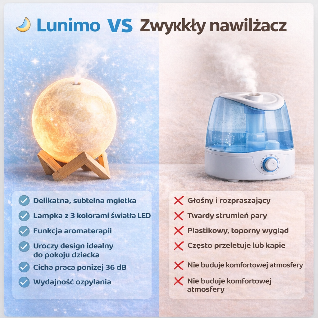 Lunimo dzięki zbiornikowi 880 ml i pracy do 30 godzin nie wymaga ciągłego dolewania wody, dlatego lepiej sprawdza się w codziennym rytmie domu.